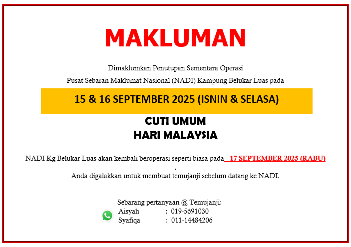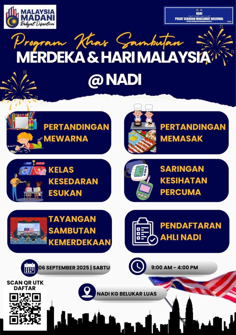 Tarikh : 06 September 2025 Masa : 9:00 pagi hingga 4:00 petang Tempat : NADI Kg Belukar Luas Peserta : Komuniti setempat Tujuan: Sempena Sambutan Hari Kebangsaan yang Ke-68, NADI Kg Belukar Luas menganjurkan pelbagai aktiviti menarik kepada komuniti setempat disamping […]