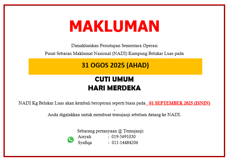 *Tarikh & Aktiviti tertakluk kepada perubahan dari masa ke semasa. Tarikh Aktiviti / Program Tempat Sepanjang Bulan Okt 2025 Open Tuition NADI Dilea NADI Kg Belukar Luas | Online 04.10.2025 Webinar Berkala Bahasa Inggeris NADI Kg Belukar Luas | Online […]